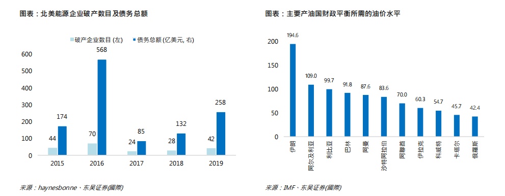 油价打击油企及产油国。2015-19 年,北美合共有 208 家能源企业破产,特别是2016 年由于油价及经济不佳,导致 70 家企业破产,总债务达 568 亿美元。低油价将会令部分竞争力较弱的页岩油生产企业停产,导致经营亏损、现金流出,最终难以应付庞大债务,导致债务违约。2018 年底,美国油气企业的债务为 4,149 亿美元,占美国总企业债务 4.5%,暂时应难以拖累整金融体系,但足以引发市场对高息债的恐慌。除油企外,产油国非常依赖石油出口作为政府主要收入来源,一旦油价下跌,若无法同时缩减支出,将会导致财政赤字加剧。据国际货币基金组织估计,主要产油国要达致财政平衡,油价需要介乎每桶 42.4 美元至 194.6 美元。因此所有产油国都出现严重财政赤字。若油价长期偏低,或令其国内政治趋向不稳定。