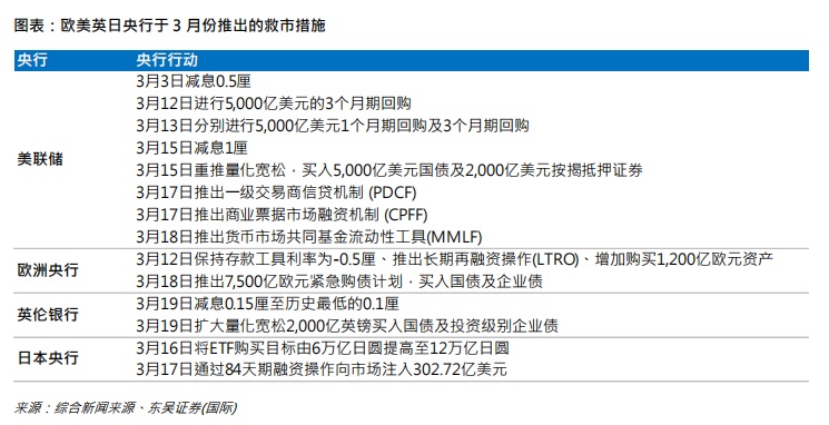 环球央行已对症下药。环球央行的货币政策无法阻止公共卫生事件扩散,不能直接推高油价,但能降低企业借贷成本,并在市场缺乏流动性时提供支持,避免出现信贷危机。美联储于 3 月推出多项措施救市,包括两次降息合共 1.5 个百分点、进行 1.5 万亿美元回购、重启量化宽松买入合共 7,000 亿美元国债和按揭抵押证券、推出仿效金融海啸时的措施包括商业票据市场融资机制(CPFF)、一级交易商信贷机制( PDCF)及货币市场共同基金流动性工具(MMLF),向市场、企业提供流动性,缓和投资者对信贷危机的恐慌,而且必要时可能仿效欧洲央行、英伦银行的买债计划,除国债外还直接买入企业债。欧美央行已对症下药支持企业渡过短期困境,缓和市场的恐慌。
