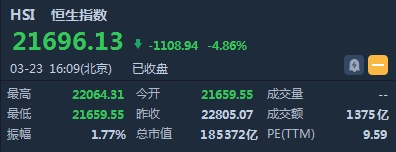 智通财经APP获悉,恒指早盘低开1145.52点或5.02%,报21659.55点。截至收盘,恒生指数跌1108.94点或4.86%,报21696.13点,全日成交额达1375.49亿。国企指数跌4.02%,报8751.76点,红筹指数跌4.91%,报3239.36点。