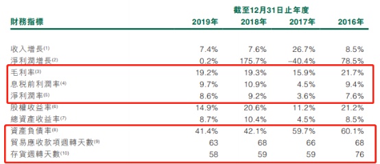 从公司自身的经营指标来看,公司2019年的毛利率与上年同期相比基本保持了稳定,净利率出现一定下滑;在经营方面,公司2019年的资产负债率从上年42.1%降至41.4%,应收账款周转天数从较上年减少5天,存货周转天数同比减少1天。