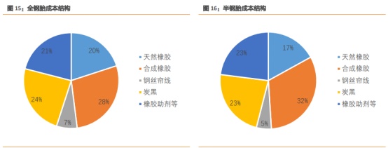 提及轮胎价格变动,很多人首先想到的是其原材料橡胶的价格变动。以浦林成山的核心产品全钢胎和半钢胎的成本结构来看,二者的原材料均以天然橡胶、合成橡胶及炭黑等为主,只是在成本比例上有所不同,所以在成本上二者均受这些原材料价格的影响。