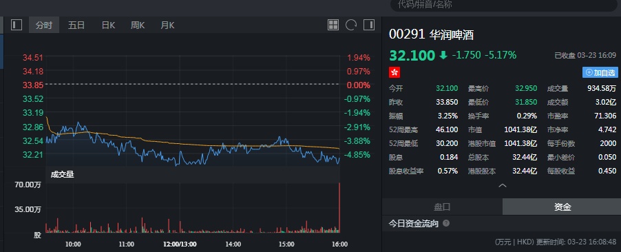 截至今日收盘,华润啤酒跌5.17%,报32.10港元。
