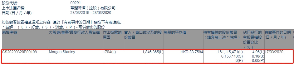 智通财经APP获悉,联交所最新资料显示,3月17日,摩根士丹利减持华润啤酒(00291)184.6365万股,每股作价33.7584港元,总金额约为6233.03万港元。减持后持股数目为1.61亿股,持股比例为4.96%。