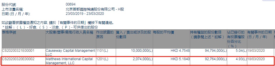 智通财经APP获悉,联交所最新资料显示,3月18日,Matthews International Capital Mgt减持北京首都机场(00694)207.4万股,每股作价5.184港元,总金额约为1075.16万港元。减持后持股数目为9276.4万股,持股比例为4.93%。