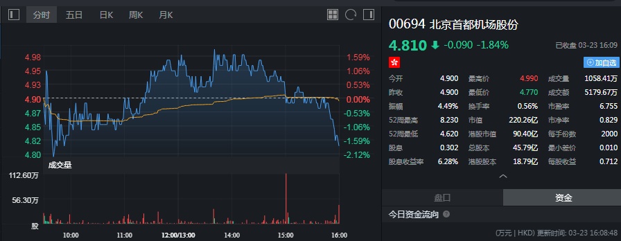 截至今日收盘,北京首都机场跌1.84%,报4.81港元。