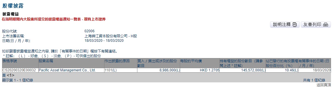智通财经APP获悉,联交所最新资料显示,3月18日,Pacific Asset Management Co., Ltd.增持锦江资本(02006)