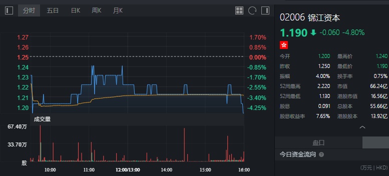 截至今日收盘,锦江资本跌4.8%,报1.19港元。