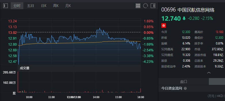 截至今日收盘,中国民航网络跌2.15%,报12.74港元。