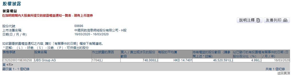 智通财经APP获悉,联交所最新资料显示,3月16日,瑞银减持中国民航网络(00696)