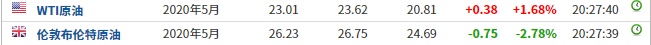 截至发稿,WTI原油涨1.68%,报23.01美元/桶。布伦特原油跌2.78%,报26.23美元/桶。