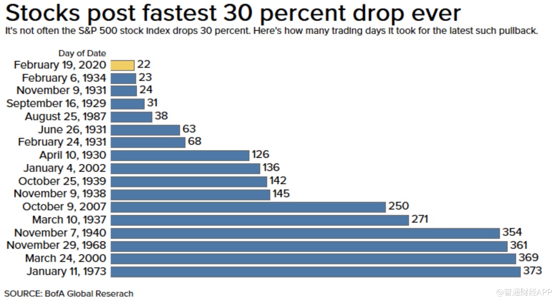 智通财经APP获悉,在二十二天内,标普500指数从历史最高点下跌了30%,速度及降幅为历史之最。