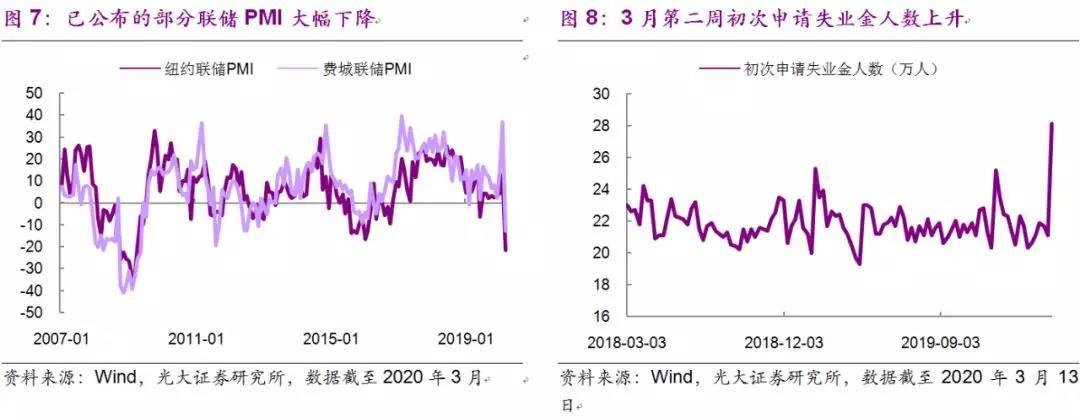 美联储政策公布后,美股小幅低开,市场反应较为冷淡。我们认为这可能与市场担心美国1、2季度的经济表现有关。过去两周,一些经济数据明显恶化,比如纽约和费城联储的3月制造业PMI指数,均已跌至近年来的新低(图7)。而未来数周,越来越多的经济数据将会出炉,市场尤其关注卫生事件冲击下的就业数据(图8)。总之,除了美联储,未来还需财政政策对冲经济下行压力。