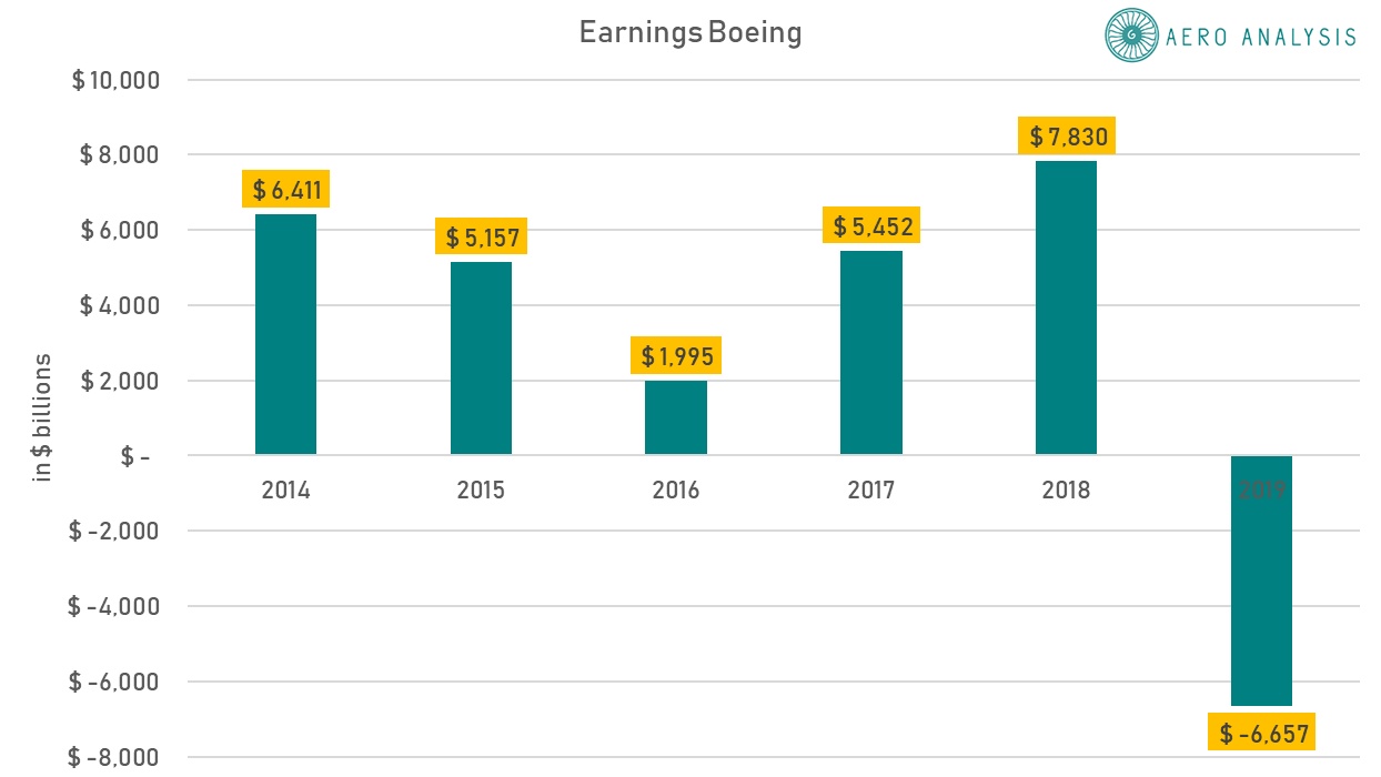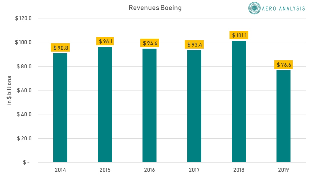 波音的营收从2014年的908亿美元增加到2018年的1011亿美元,年复合增长率约为3%。在2019年,收入下降到766亿美元,反映了波音737 MAX引起的危机。如果没有波音737 MAX危机,2019年的收入将达到1100亿美元,年复合增长率为4%。