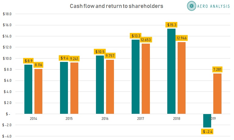 当投资者看到运营现金流和返还给股东的数量时,就会明白为什么波音需要借入现金。过去几年,波音公司在回购股票(406亿美元)和支付股息(194亿美元)上花费了大约600亿美元(确切地说,是599.94亿美元),而期间产生的运营现金流大约550位亿美元。波音公司将所有运营现金流返还给股东。50亿美元的额外支出是在2019年造成的,这一年波音把钱花在派息和回购上,而营运现金流却下降了。排除2019年,等于波音将92%的营运现金流和113%的自由现金流返还给股东。