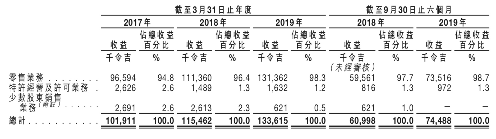 由于集团的业务性质,于2017年、2018年及2019年,来自零售业务的收益占总收益约94.8%、96.4%及98.3%,余下收益通常来自特许经营及许可业务及少数股东销售业务。上述三个年度中,没有任何客户占其总收益的5%或以上。