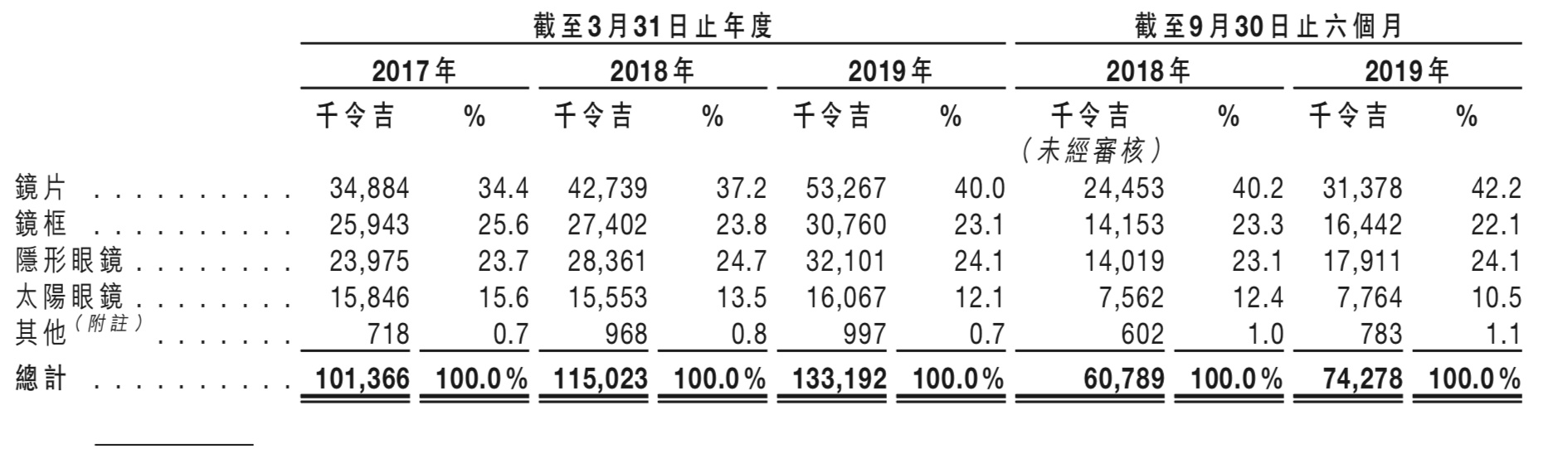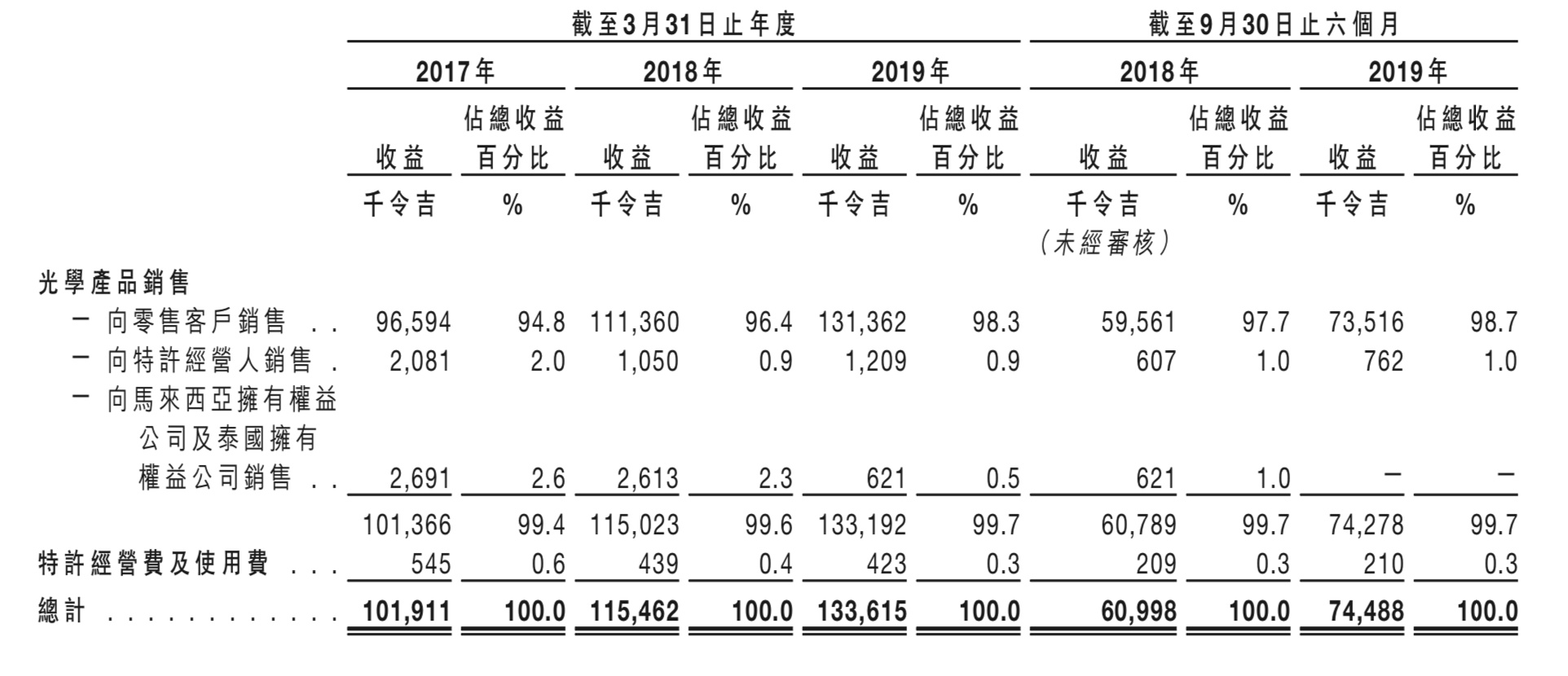 镜片销售为MOG销售光学产品所得收益的最大贡献来源,自2017财年至2019财年按约23.6%的复合年增长率增长。同期,销售镜框所得收益也按约9%的复合年增长率增长。