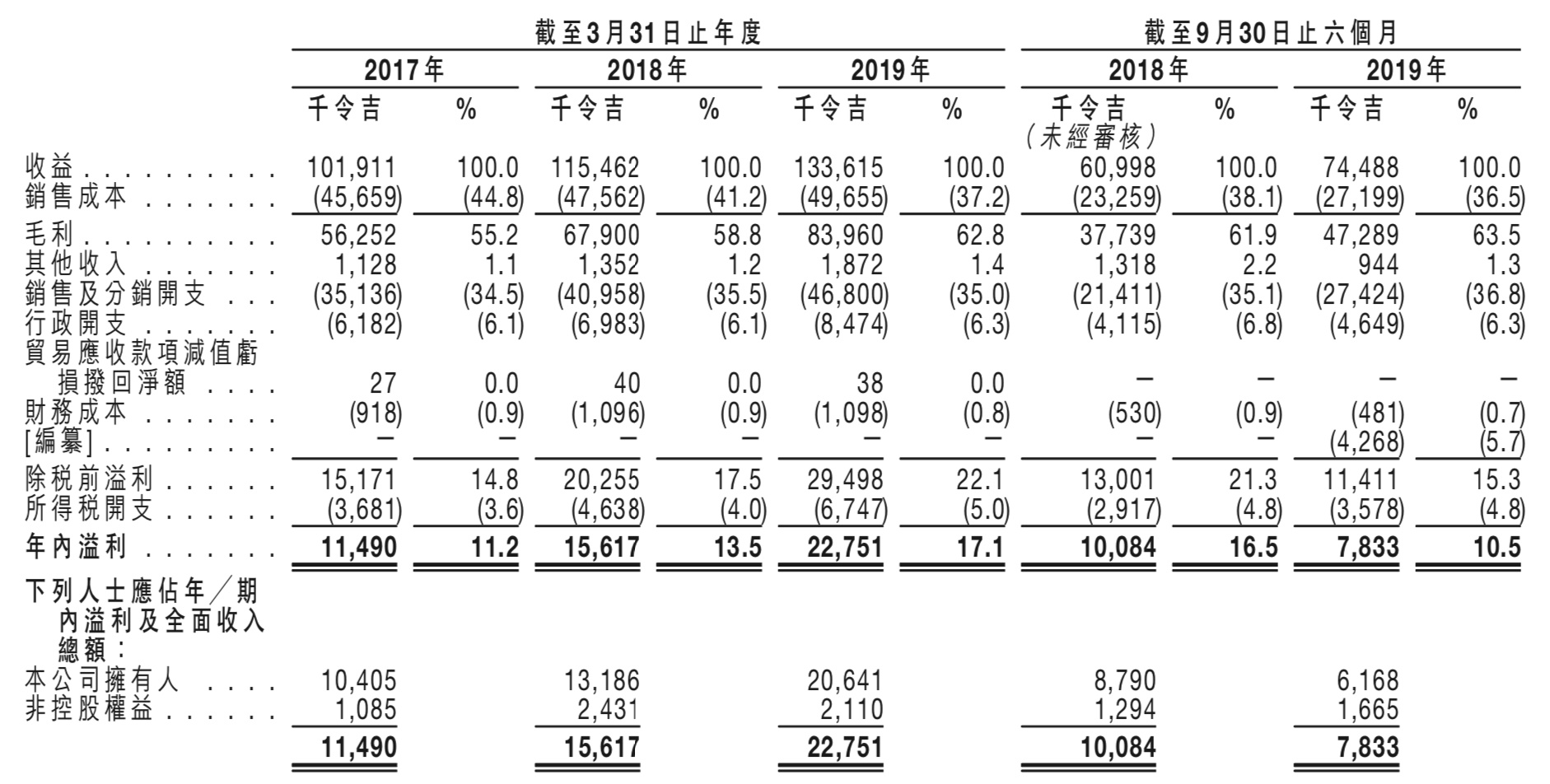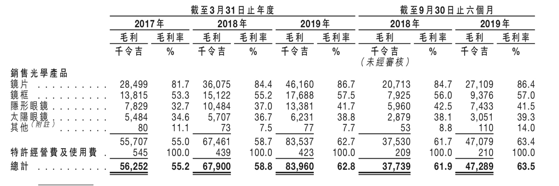 2017、2018、2019财年及截至2019年9月30日止六个月,MOG销售光学产品的毛利分别约为5570万令吉、6750万令吉、8359万令吉和4710万令吉。毛利率由2017年的约55%增至2019年的约62.7%。