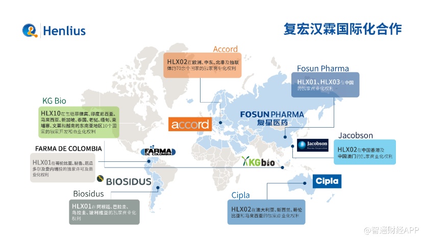 智通财经APP了解到,截至2019年,复宏汉霖已就3大重磅产品HLX01、HLX02和HLX10与Accord、Cipla、Biosidus、Jacobson、KG Bio、Farma De Colombia等知名国际制药企业达成合作,覆盖欧洲、拉丁美洲、东南亚、中东、北非等近100个国家及地区。