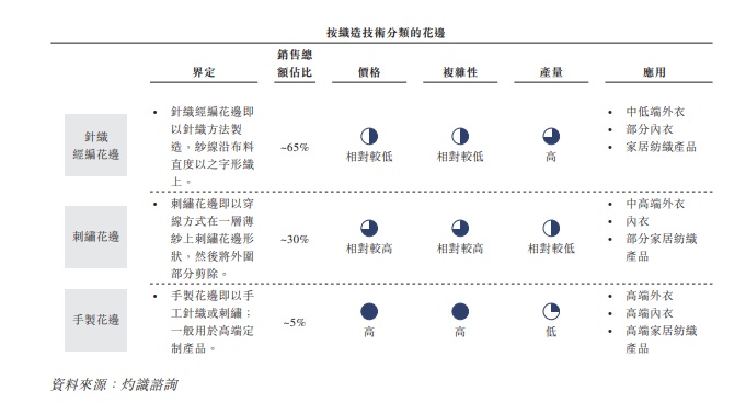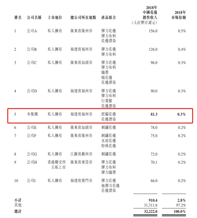 灼识谘询的数据显示,该公司2018年国内花边销售收入约人民币8130万元,市场份额0.3%,在所有花边制造商之中名列第五。
