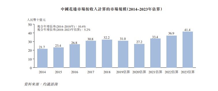 根据灼识谘询的调查,中国花边销售收入总额从2014年约人民币217亿元增至2018年约人民币322 亿元,复合年增长率10.4%。2014年至2015年期间,花边销售稳定增加,至2016年及2017年,花边销售因电子商务的快速发展和知名服装品牌登场而快速增长。然而,由于高估市场规模,2018 年网上成衣零售放缓,成衣制造商面临纺织物料库存过量,其中包括花边布料。因此,花边销售于2018年四季度和2019年下滑。