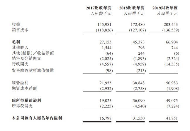 招股书显示,在过去的2017年、2018年和2019年三个财政年度,德运控股的营业收入分别为 1.46 亿、1.72 亿和 2.03 亿元人民币,相应的净利润分别为 1,679.8 万、3,155.0 万 和 4,185.1 万元人民币。毛利分别约人民币2716万元、人民币4537万元及人民币6690万元,同期毛利率分别约为18.6%、26.3%及32.9%。