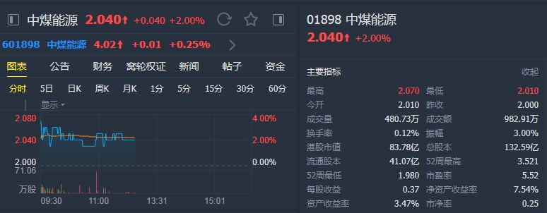 该行上调对中煤H股评级,由“沽售”升至“中性”,主因其估值相当于今年预测市账率0.25倍,对比股本回报率为5.6%,目标价则由2.5港元降至2.3港元,并认为股份现价有平衡的风险回报。