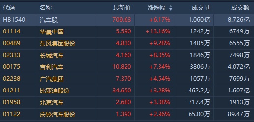 截至发稿,华晨中国(01114)涨13.36%,报5.6港元;东风集团股份(00489)涨9.05%,报4.82港元;长城汽车(02333)涨7.79%,报4.15港元;吉利汽车(00175)涨7.34%,报10.82港元。