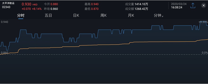 截至今日收盘,太平洋航运涨8.14%,报0.93港元。