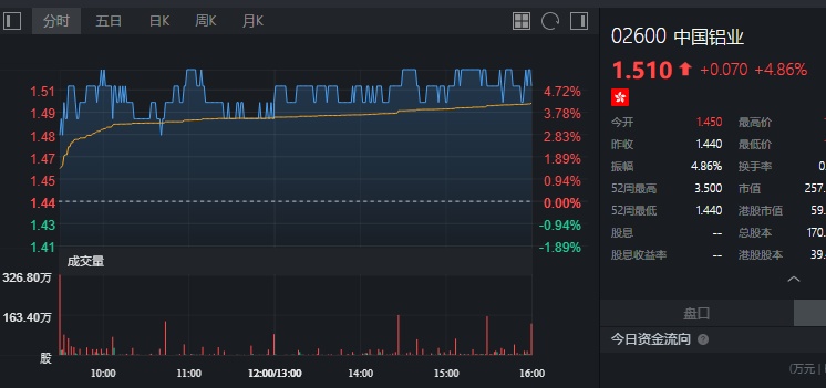 截至今日收盘,中国铝业涨4.86%,报1.51港元。