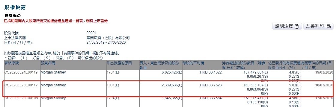 智通财经APP获悉,联交所最新资料显示,3月18日,大摩增持华润啤酒(00291)238.96万股,每股作价33.7523港元,涉及总金额约为8065.45万港元。增持后最新持股数目约为1.635亿股,最新持股比例5.03%。