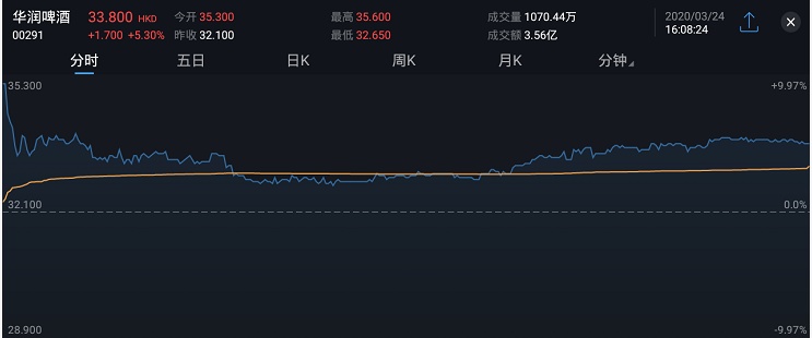 截至今日收盘,华润啤酒涨5.3%,报33.8港元。