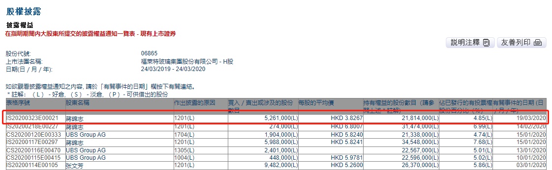 智通财经APP获悉,联交所最新资料显示,3月19日,股东蒋锦志减持福莱特玻璃(06865)526.1万股,每股作价3.8267港元,涉及总金额约为2013.23万港元。减持后最新持股数目约为2181万股,最新持股比例4.85%。
