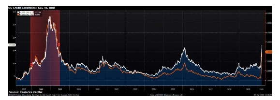 现在大家也关注了很多美国市场信用债市场。BBB、CCC级信用债收益率迅速攀升,超过15年市场剧烈波动时的水平,达到2008年9-10月的水平,市场对评级低的债券是非常悲观的。