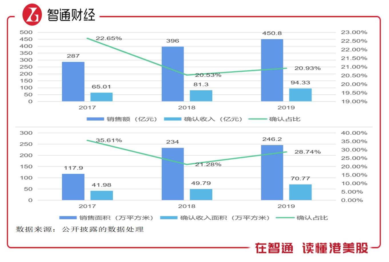 德信中国的销售面积每年也在逐年创新高,2019年为246.2万平方米,确认收入面积70.77万平方米,近三年复合增长率分别为44.5%和30%,期间确认收入面积占比28.74%,同比提升7.46个百分点。
