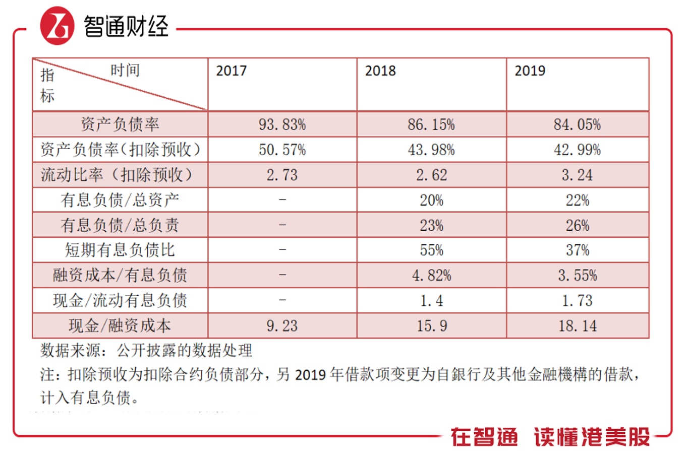 房地产作为高杠杆运营的行业,负债管理尤为重要。德信在负债管理上一直处于优化状态,负债水平也远低于行业,2019年资产负债率为84.05%,而行业普遍在90%以上,且该公司债务水平逐年降低。若扣除非负债的预收款部分(合约负债),资产负债率仅为42.99%,流动比率3.24倍,财务状况非常健康。