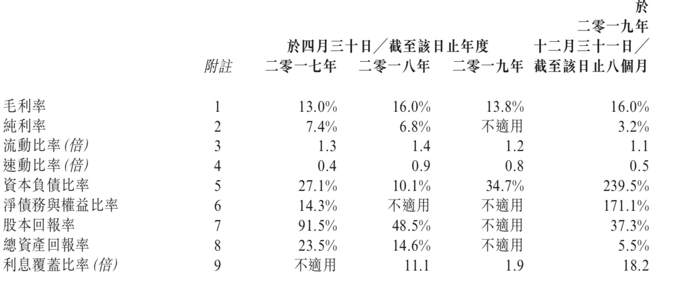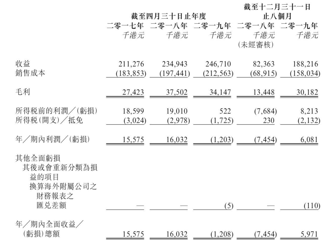 2017及2018财年年内利润为1557.5万港元、1603.2万港元,2019财年年内亏损为120.3万港元,2020财年前八个月期内利润为608.1万港元。