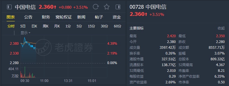 智通财经APP获悉,瑞信发布报告称,下调中国电信(00728)目标价6.3%,由3.48港元调低至3.26港元,评级由“中性”升至“跑赢大市”。