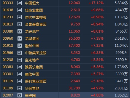 截至14时18分,中国恒大(03333)涨17.12%,报价12.04港元,佳兆业集团(01638)涨9.66%,龙光地产(03380)涨8.01%,龙湖集团(00960)涨7.39%,融创中国(01918)涨7.32%,融信中国(03301)涨5.27%,碧桂园(02007)涨4.88%,宝龙地产(01238)涨5.54%。
