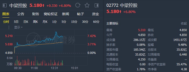 该行预计,中梁2019年的核心利润同比增长102%至39亿元人民币,2020年同比增长23%至48亿元人民币,派息率40%,则2019年的股息收益率将达11.3%,2020年的股息收益率更将达12.3%,公司是该行覆盖股中的最高之一。