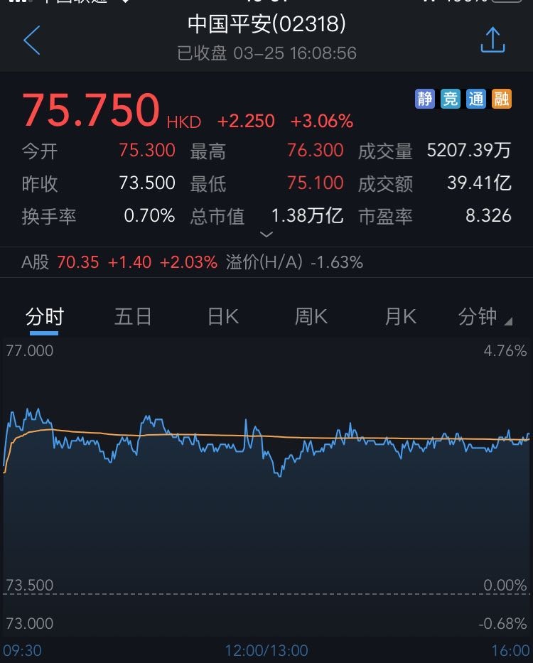 截至今日收盘,中国平安涨3.06%,报75.75港元。