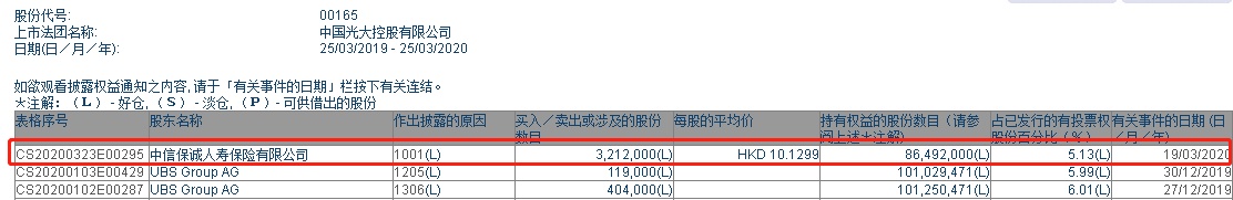 智通财经APP获悉,联交所最新资料显示,3月19日,中信保诚人寿保险增持光大控股(00165)321.2万股,每股作价10.1299港元,总金额约为3253.72万港元。增持后最新持股数目约为8649.2万股,最新持股比例5.13%。