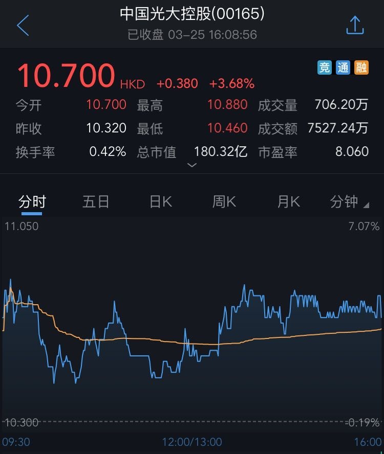 截至今日收盘,中国光大控股涨3.68%,报10.7港元。