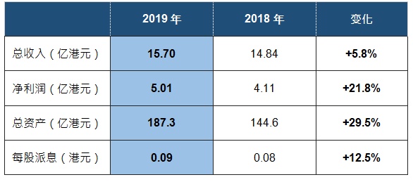 截至2019年12月31日,公司总资产为187.30亿港元,较2018年底增长29.5%;公司董事会建议派发末期股息每股0.09港元,派息比率连续三年达49%以上。