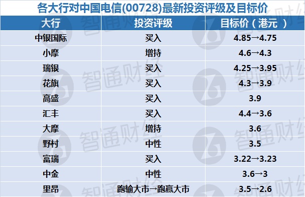 七、各大行对中国电信(00728)最新投资评级及目标价