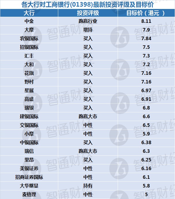 八、各大行对工商银行(01398)最新投资评级及目标价