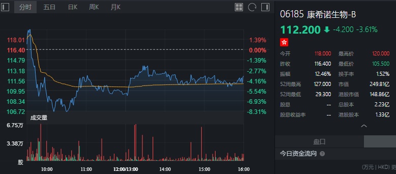 截至今日收盘,康希诺生物-B跌3.61%,报112.2港元。