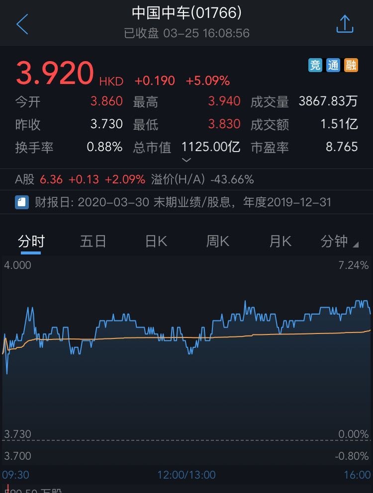 截至今日收盘,中国中车涨5.09%,报3.92港元。