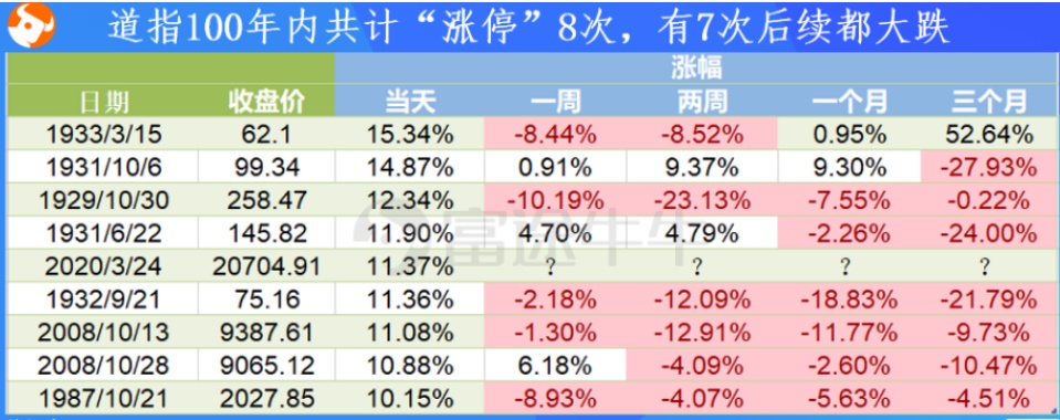 图:道指单日涨幅超10%,后续1周、2周、1月、3月表现 来源:富途牛牛