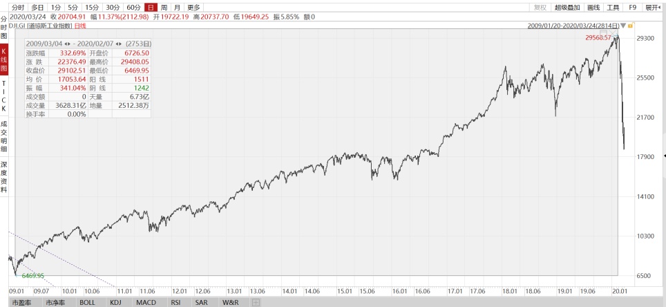 图:2009-2020年高点 道指涨幅332% 来源:WIND