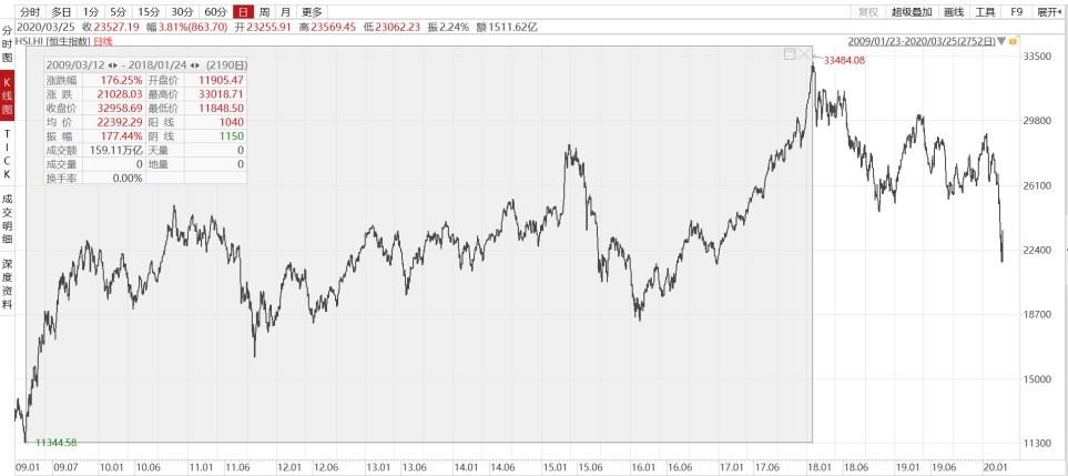 图:2009-2020,恒指到2018年高点,涨幅176% 来源:wind